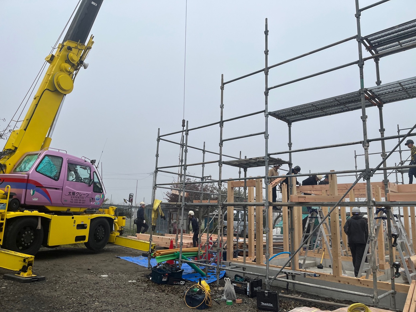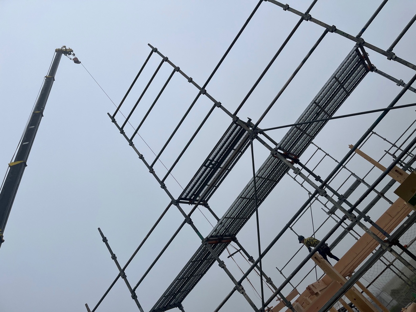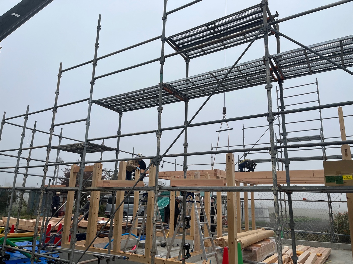 霧が立ち込める朝、いよいよ建方スタート!