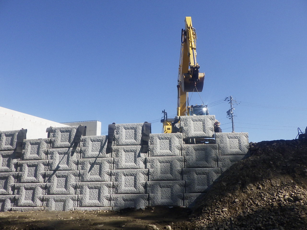 道路構造を支える補強土壁の基礎部分を丁寧に掘削。