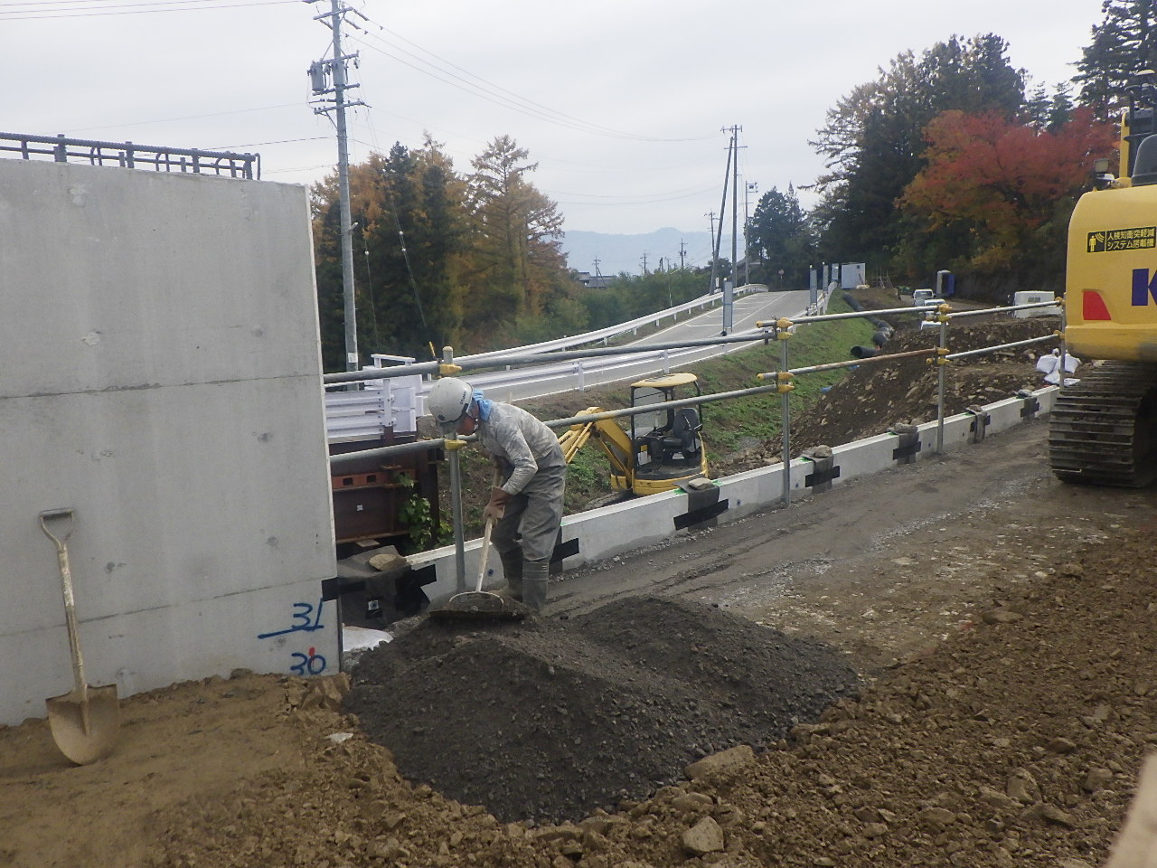 補強土壁上部に設置するガードレールの基礎砕石を施工。